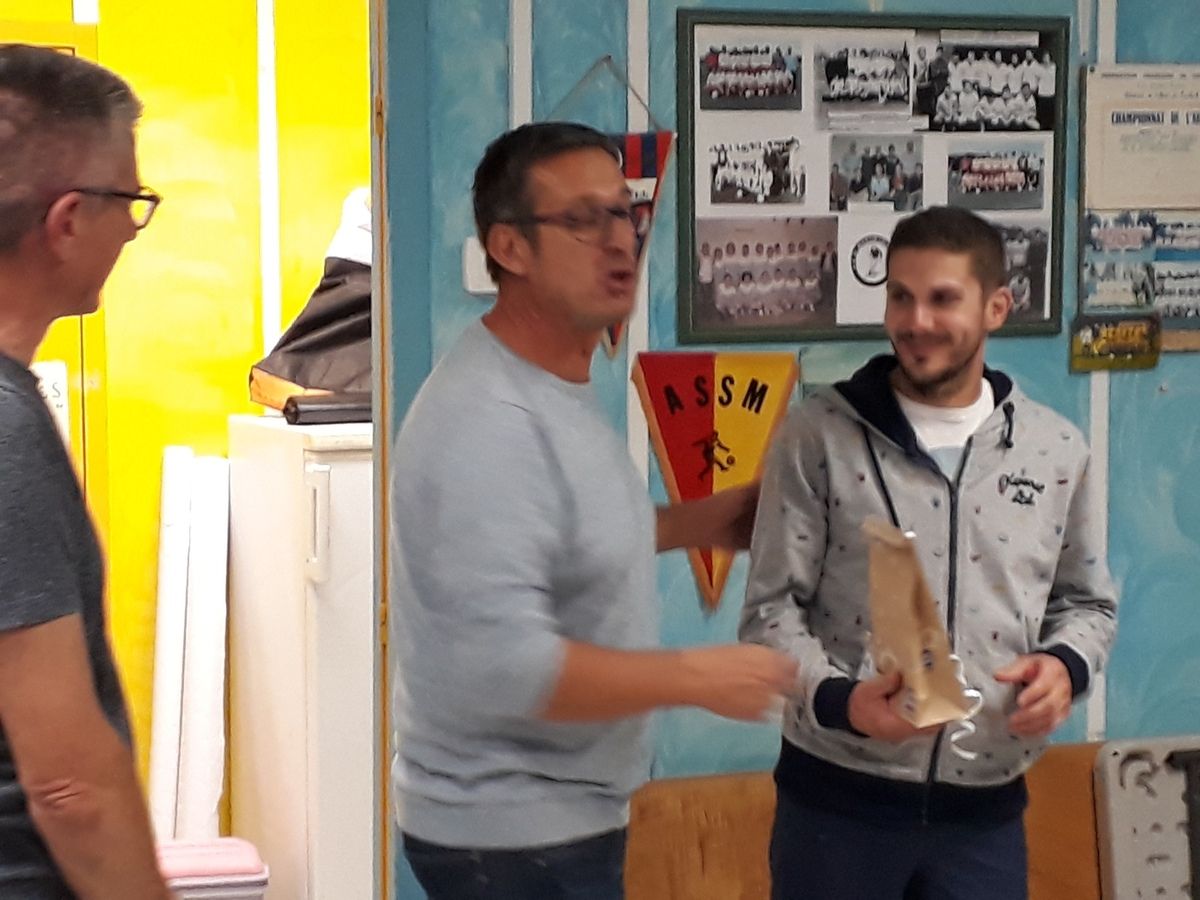 Au préfa, tout ce beau monde a pu refaire le match autour d'une grillade et de quelques cagnes. Le président a profité de l'occasion pour offrir un cadeau à notre buteur maison, Loïc qui vient d'être .....jeune papa .